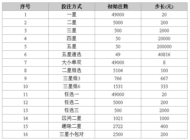 1、初始限制:初始注数是指当某种投注方式的销售额为零,每种投注方式下每注投注号码允许销售的最大投注注数。步长指销售注数增加一注,某种投注方式销售额需要增加的金额。具体设置如下表: